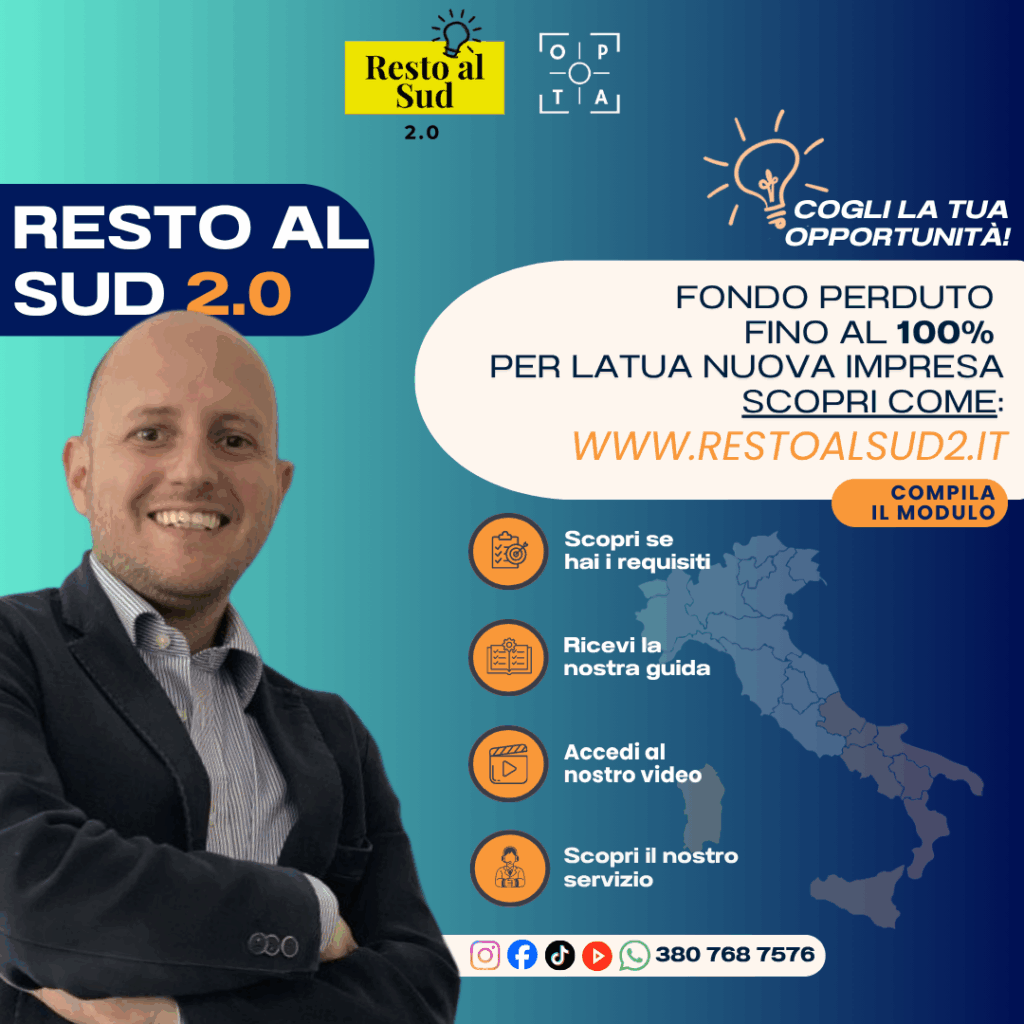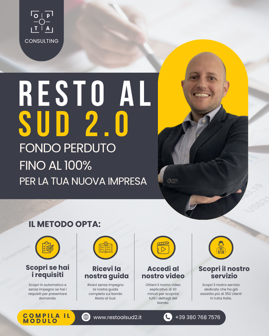 Vuoi presentare una domanda per il Bando Resto al Sud 2.0? Affidati alla prima agenzia in Italia con più di 350 progetti approvati. Scegli un servizio dedicato e altamente specializzato, offerto al prezzo più basso del mercato.